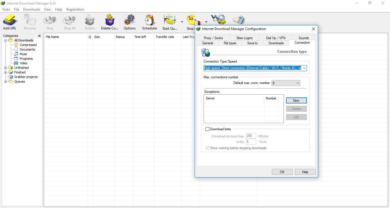 Pertama silahkan buka Internet Downlaod Manager. lalu pilih menu Options akan muncul tampilan baru kita pilih Connection. pada bagian Connection Type/Speed klik label dan pilih urutan paling bawah High speed: Direct connection (Ethernet/Cable) / Wi-Fi / Mobile 4G / other lalu ok.